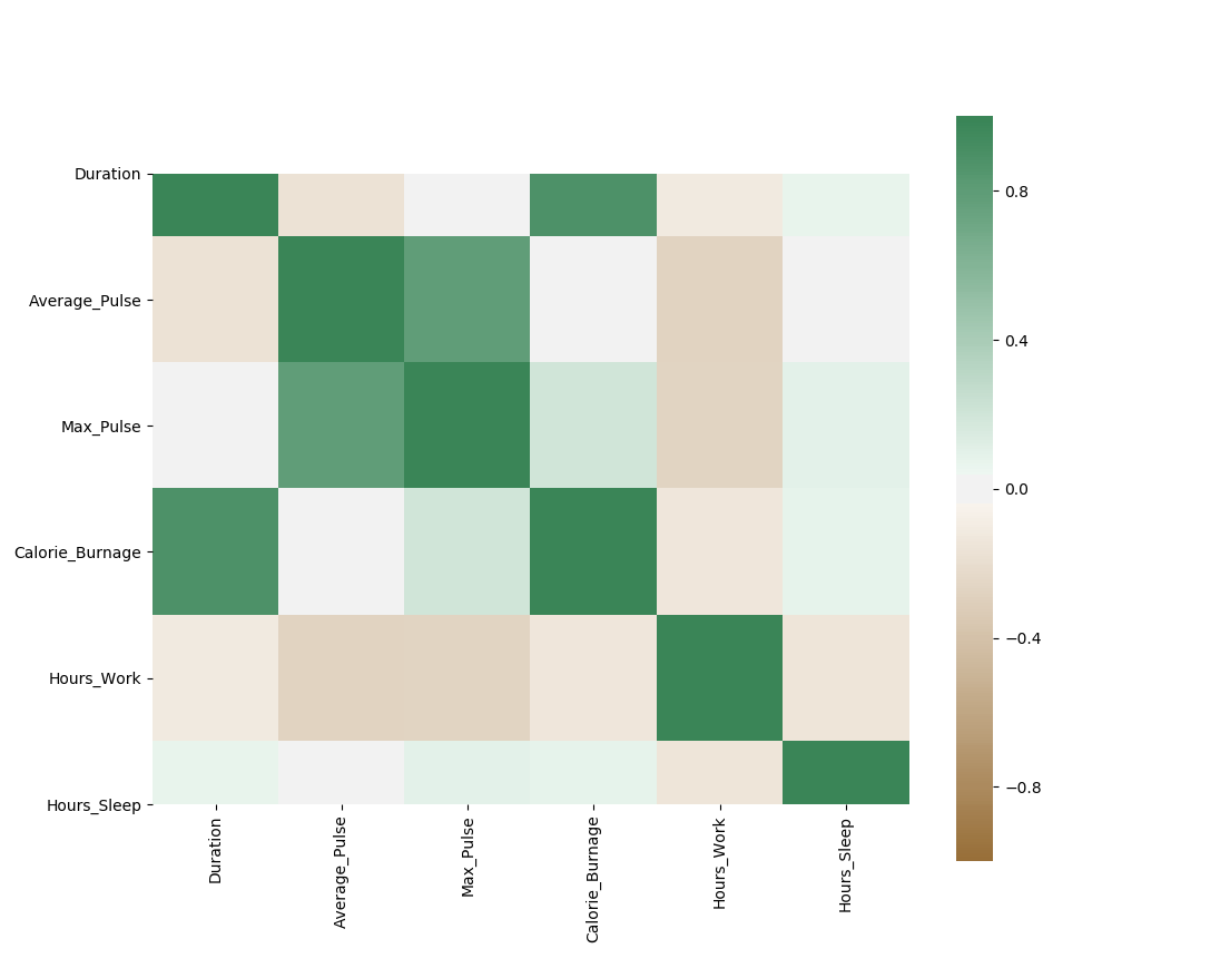 import pandas as pd import matplotlib.pyplot as plt import seaborn as sns full_health_data = pd.read_csv("dataset.csv", header=0, sep=",") correlation_full_health = full_health_data.corr() axis_corr = sns.heatmap( correlation_full_health, vmin=-1, vmax=1, center=0, cmap=sns.diverging_palette(50, 500, n=500), square=True ) plt.show()