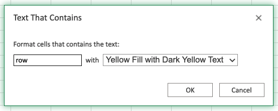 Now, the cells with values Text That Contains "row" will be highlighted in yellow: