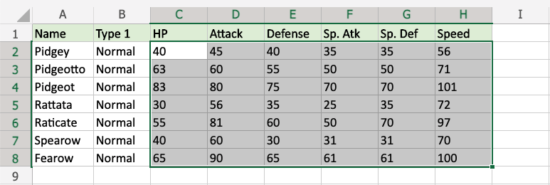 The names "Pidgey", "Pidgeot", and "Pidgeotto" all start with "Pidge", so all these cells are highlighted.