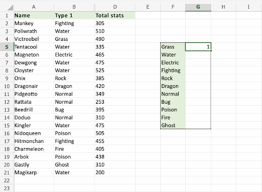 Apply the COUNTIF function to range B2:B21, to count how many Pokemons we have in the different types: