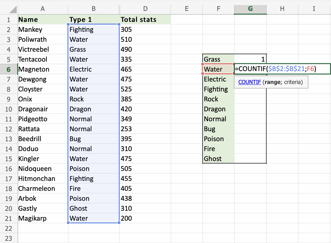 That is great! The COUNTIF function has counted 6 Water Pokemons in B2:B21.