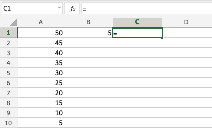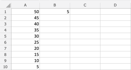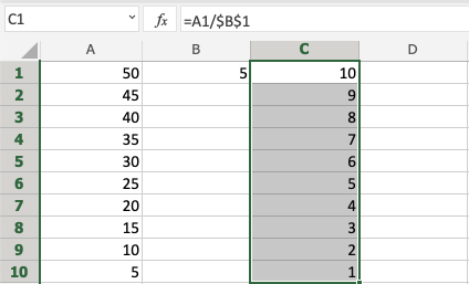 Good job! You have successfully used absolute reference to divide B1(5) with the range A1:A10.
