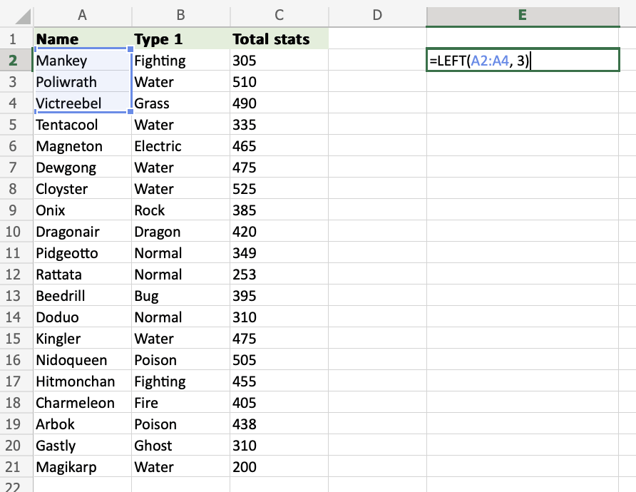 A2:A4) and define the length of characters you want to retrieve, using a,as a delimiter (A2:A4,3) - Hit enter