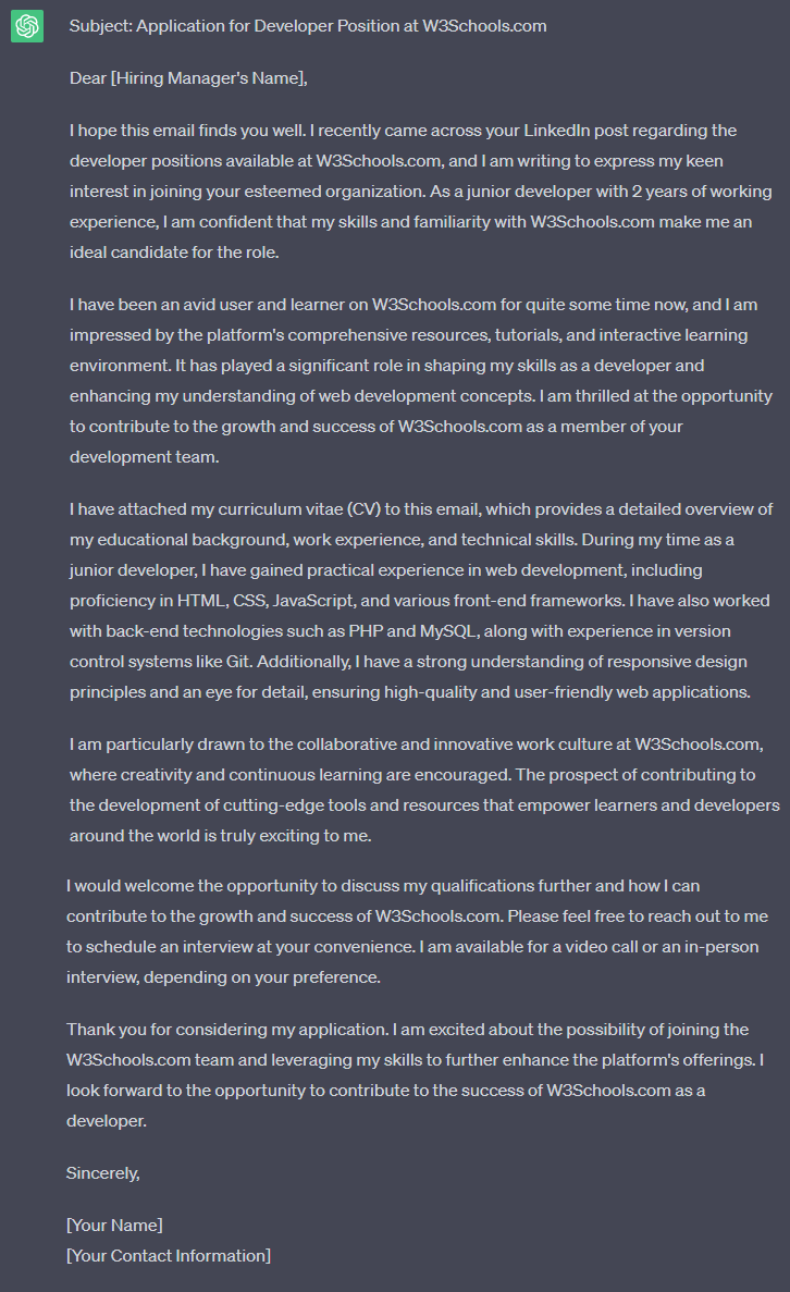 Write a professional email responding to a Linkedin post asking for developers at W3Schools.com. I have 2 years of working experience as a junior developer and am very familiar with the company. My CV will be attached to this email.