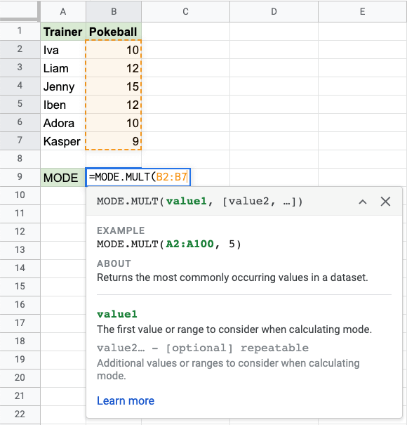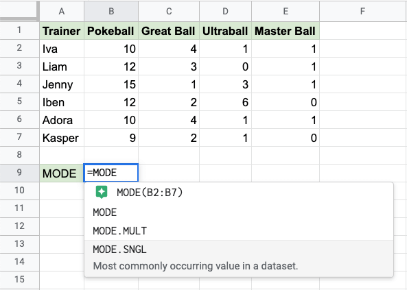 The MODE function is a premade function in Google Sheets, which is used to find the most common value(s).