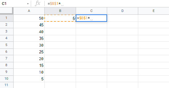 You got it! You have successfully used absolute reference to multiply B1(5) with the range A1:A10.